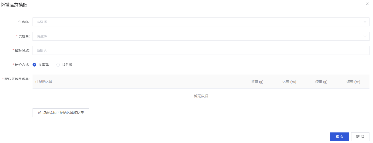 添加配送方式:支持设置多种不同配送模板,支持按重量计费或者按件计费设置配送模板,配送模板支持设置不同区域不同费用
