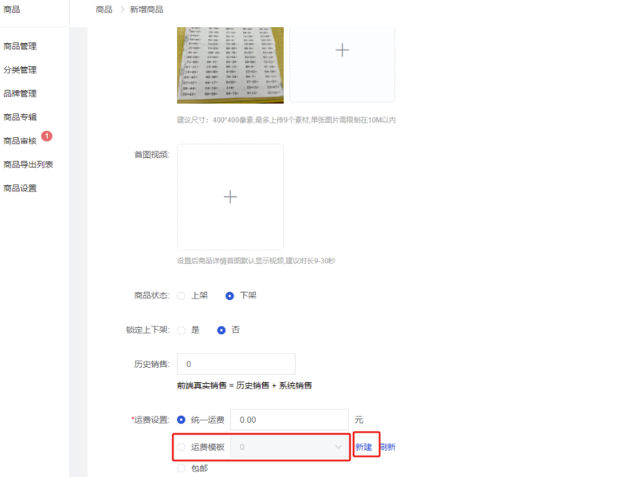 后台商品支持选择运费模板,也可以创建新的运费模板之后再进行选择。如下图所示。