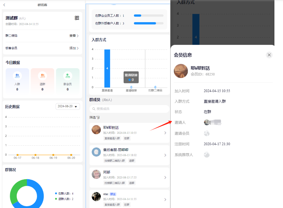 3)邀请人会员,只有通过群拓客二维码邀请的,才能获取到邀请会员,直接拉人进群是没有的.